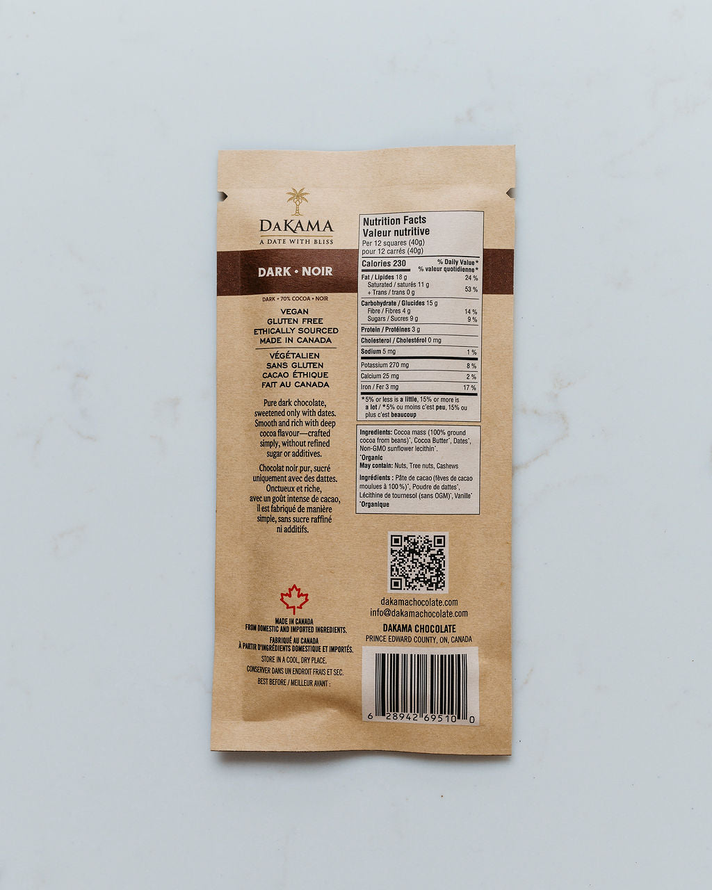 Dakama chocolate uses all organic ingredients and is hand-crafted in Canada.
